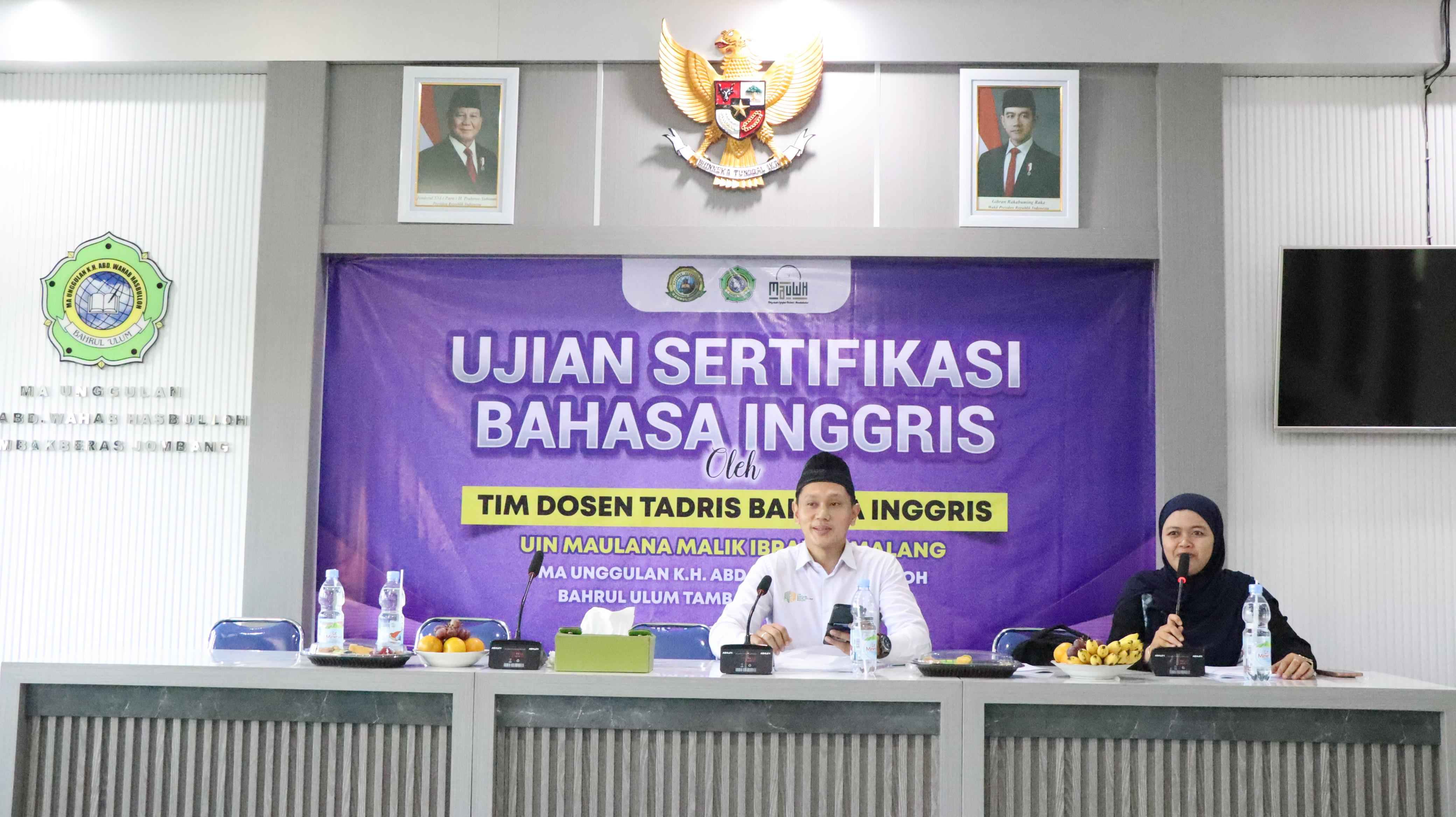 MAUWH.sch.id – MA Unggulan K.H. Abd. Wahab Hasbullah Bahrul Ulum Tambakberas Jombang (MAUWH), terus memperluas inovasi pendidikan dengan menyelenggarakan Ujian Sertifikasi Bahasa Inggris bagi siswa kelas XII pada hari Kamis, 25 September 2025 di aula gedung A. Kegiatan yang digelar di Aula Gedung A ini merupakan hasil kerja sama dengan Universitas Islam Negeri Maulana Malik Ibrahim Malang (UIN Malang), yang menghadirkan tim penguji dari kalangan akademisi berpengalaman.