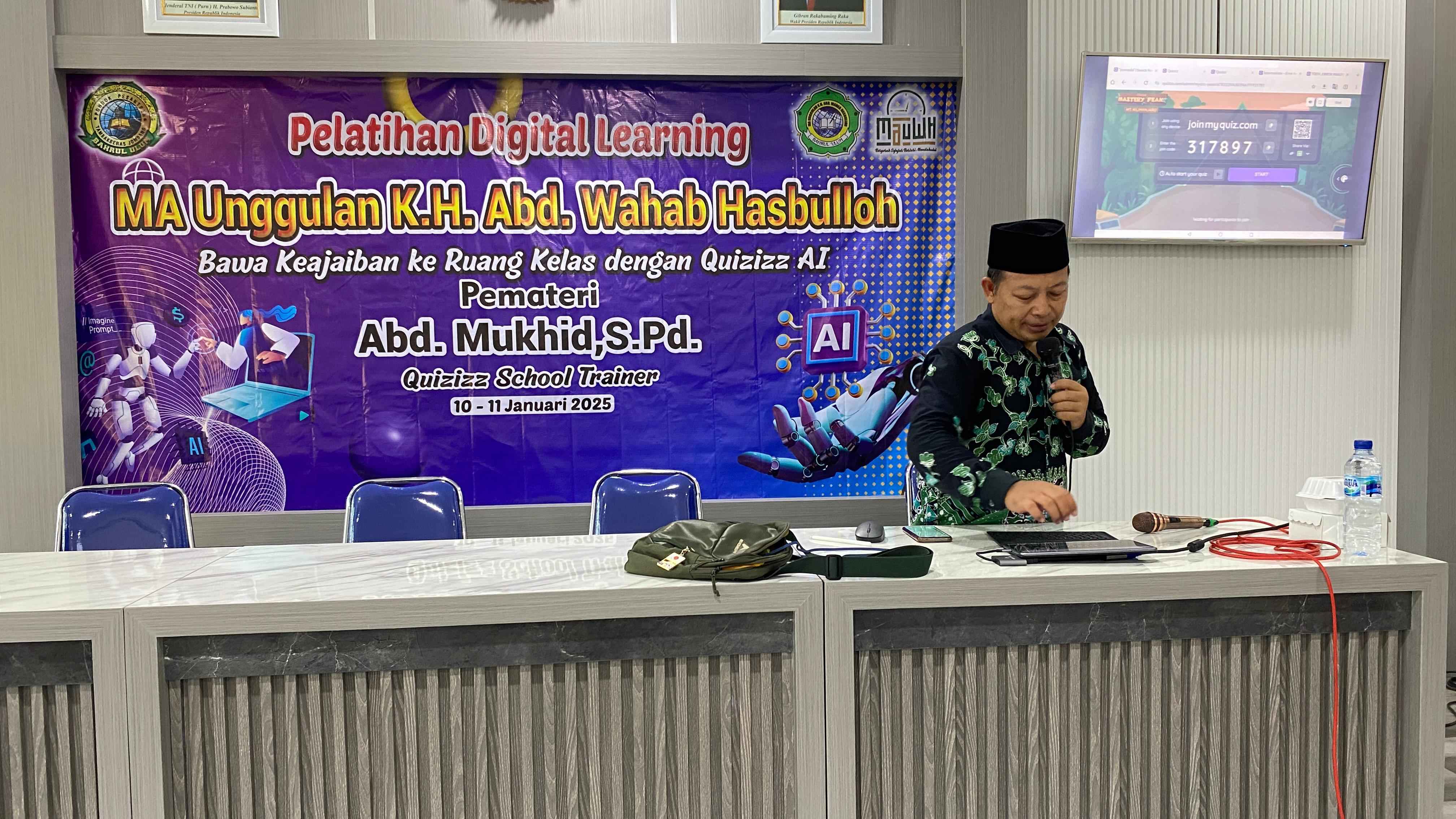 MAUWH.SCH.ID – MA Unggulan K.H. Abd. Wahab Hasbulloh kembali menunjukkan komitmennya dalam meningkatkan kualitas pendidikan dengan sukses menggelar Pelatihan Digital Learning. Kegiatan ini berlangsung di Aula Gedung A MAUWH pada hari Sabtu, 11 Januari 2025. Pelatihan yang diikuti oleh tenaga pendidik ini mengusung tema “Bawa Keajaiban ke Ruang Kelas dengan Quizizz AI.”