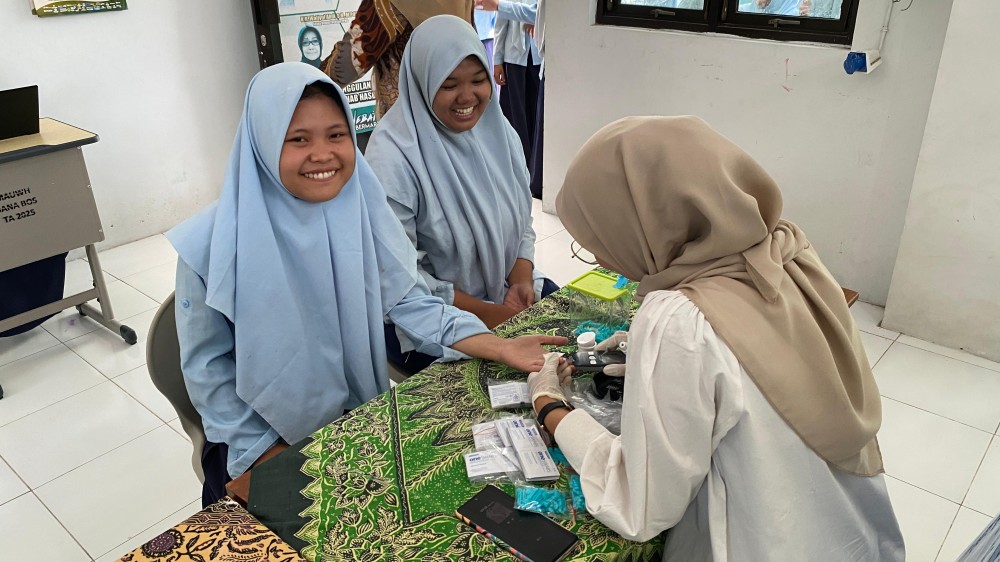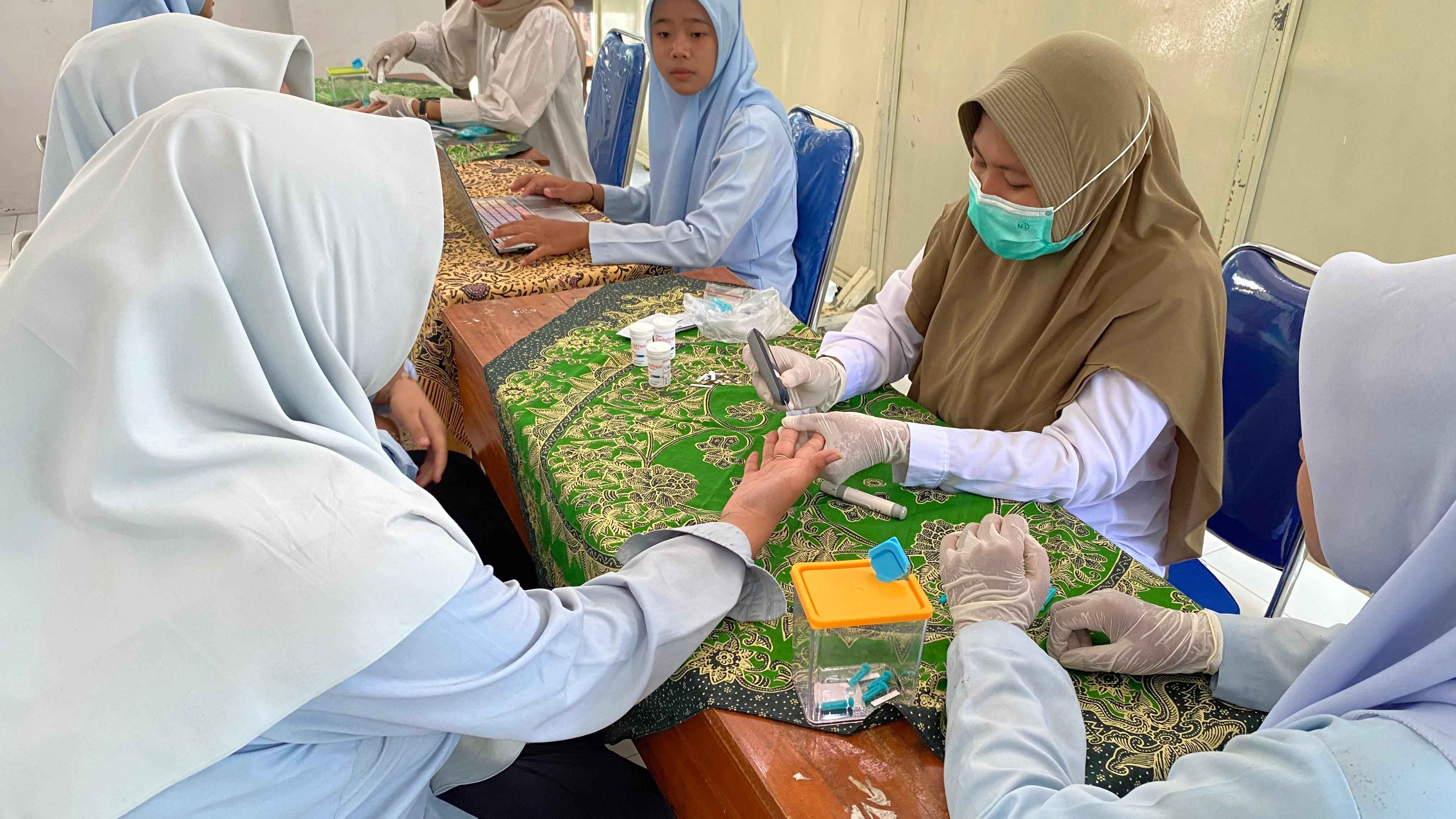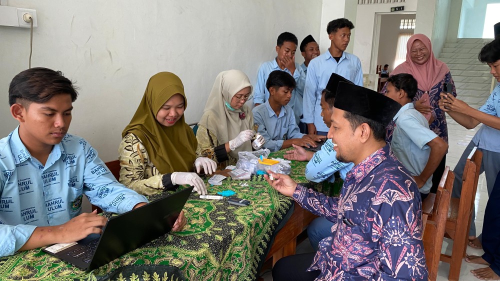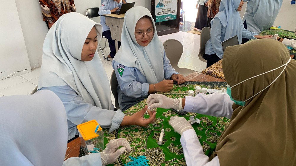 Pemeriksaan yang dilakukan mencakup berat badan, tinggi badan, tekanan darah, GDA, dan HB. Siswa terlihat antusias—ada yang penasaran dengan hasilnya, ada yang saling membandingkan tinggi badan, dan ada pula yang baru pertama kali memeriksa GDA sehingga terlihat sedikit deg-degan.